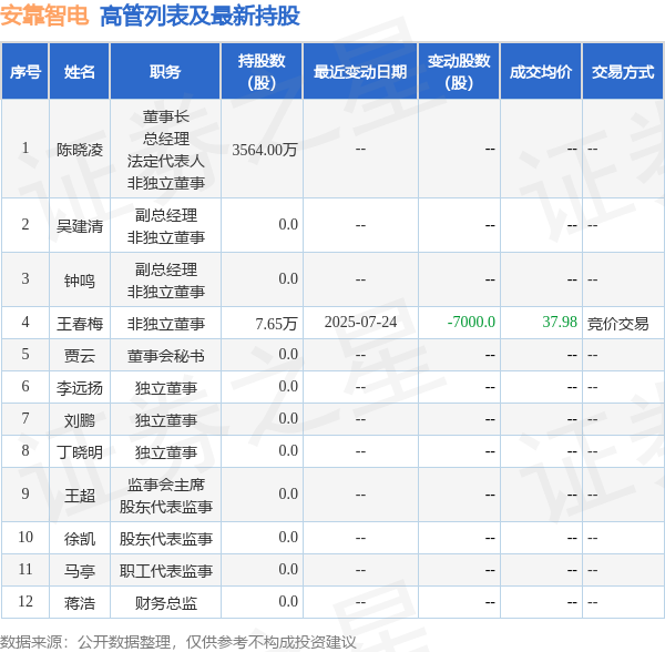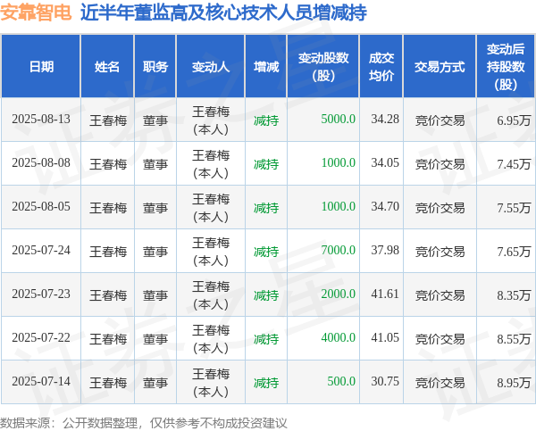 安靠智电近半年内的董监高及核心技术人员增减持详情如下: